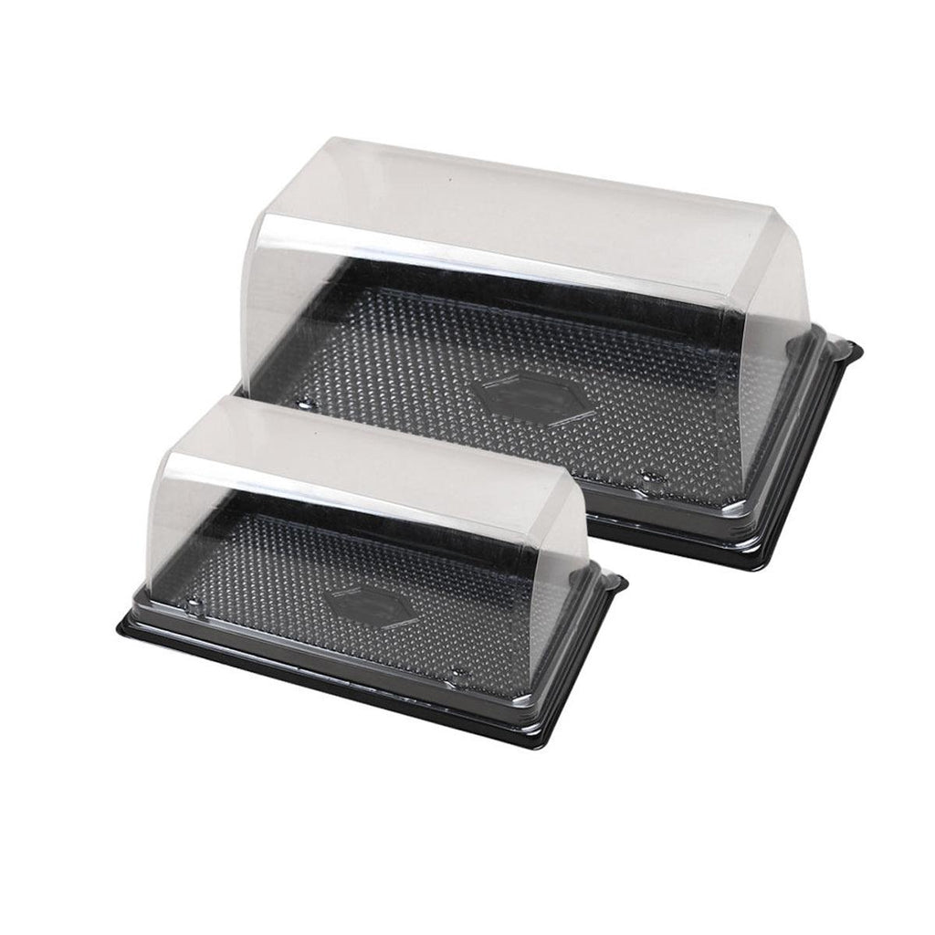 This long arch transparent cake box is designed for packaging baked goods such as cake rolls, omelets, and bread. Featuring a clear lid, it allows for easy display while keeping food fresh. The black non-slip base provides a premium feel, making it ideal for home use, bakeries, and takeaway packaging.