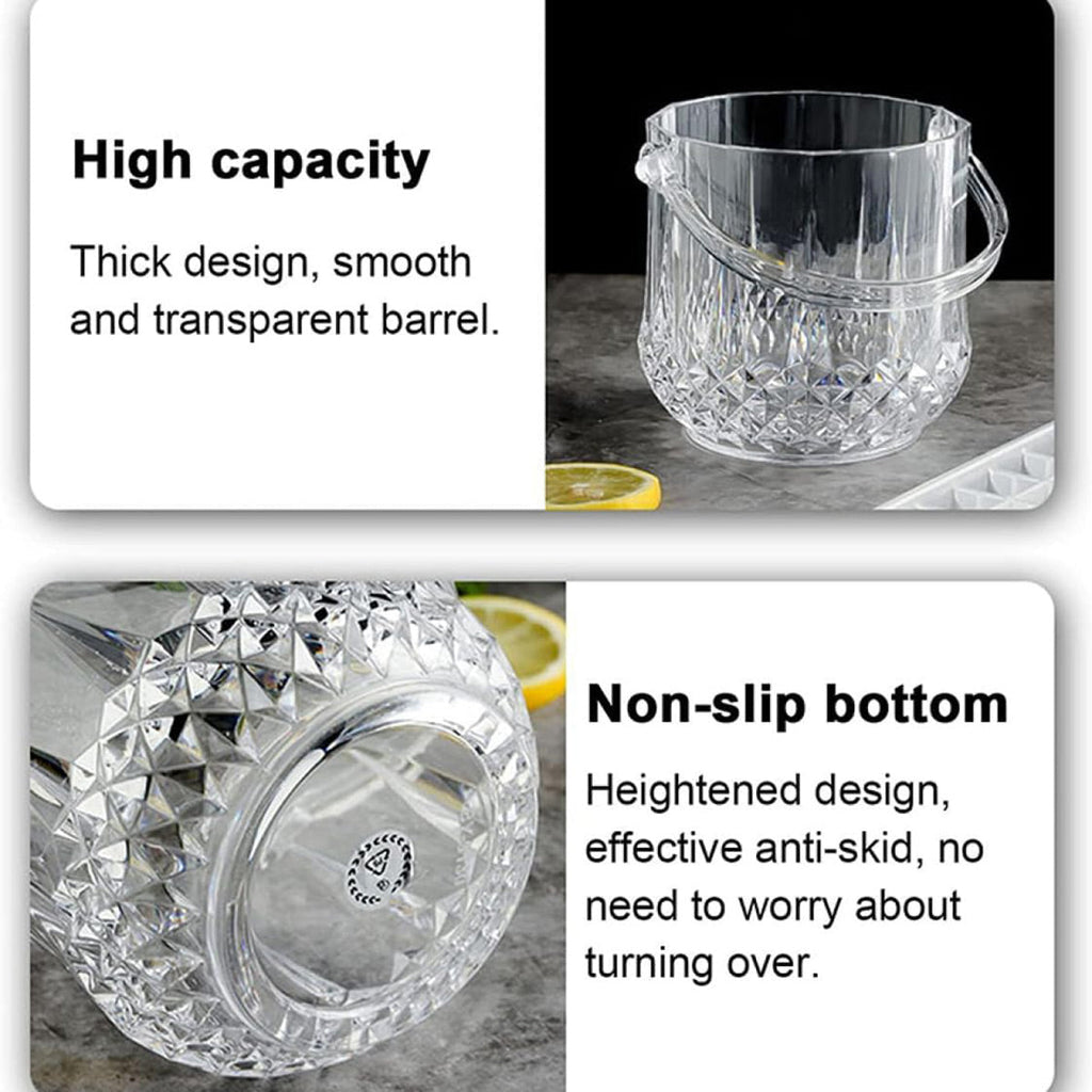This stylish acrylic ice bucket features a crystal-clear finish with diamond or crystal patterns for a premium look.Designed for home bars, parties, and special occasions, it keeps beverages chilled and accessible.The detachable handle ensures easy transport, while the included clip adds serving convenience.Its thick, transparent body provides both durability and elegance, perfect for any setting from bars to milk tea shops.