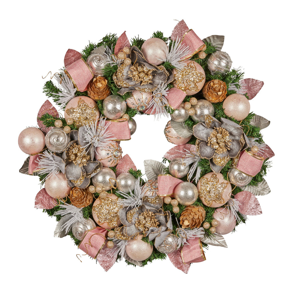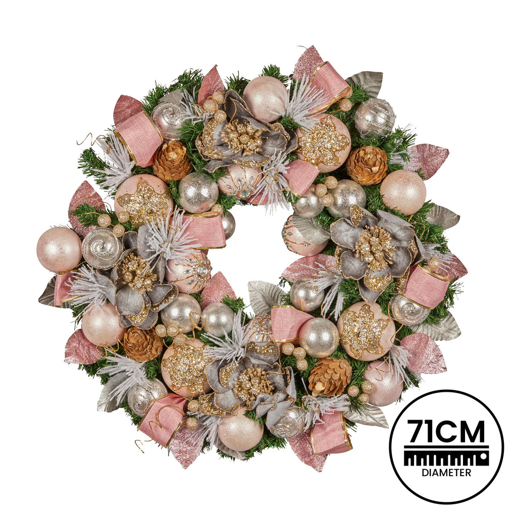 Deck your doorway in decadence. This lush green wreath sparkles with jewelled baubles, florals, pine cones and ribbon in elegant pink, champagne and silver. Fully pre-decorated and perfectly sized for walls, doors or mantels, it’s a ready-made Christmas statement that brings festive charm without lifting a decorating finger.