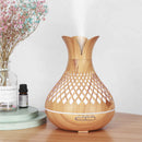 With an elegant wood grain flower top vase design, this 500ml ultrasonic electric air mist ultrasonic humidifier is used for aromatherapy by diffusing essential oils and mist into the air. Remote controlled, the diffuser is useful as a night light featuring 7 controllable colour changing LED lights.