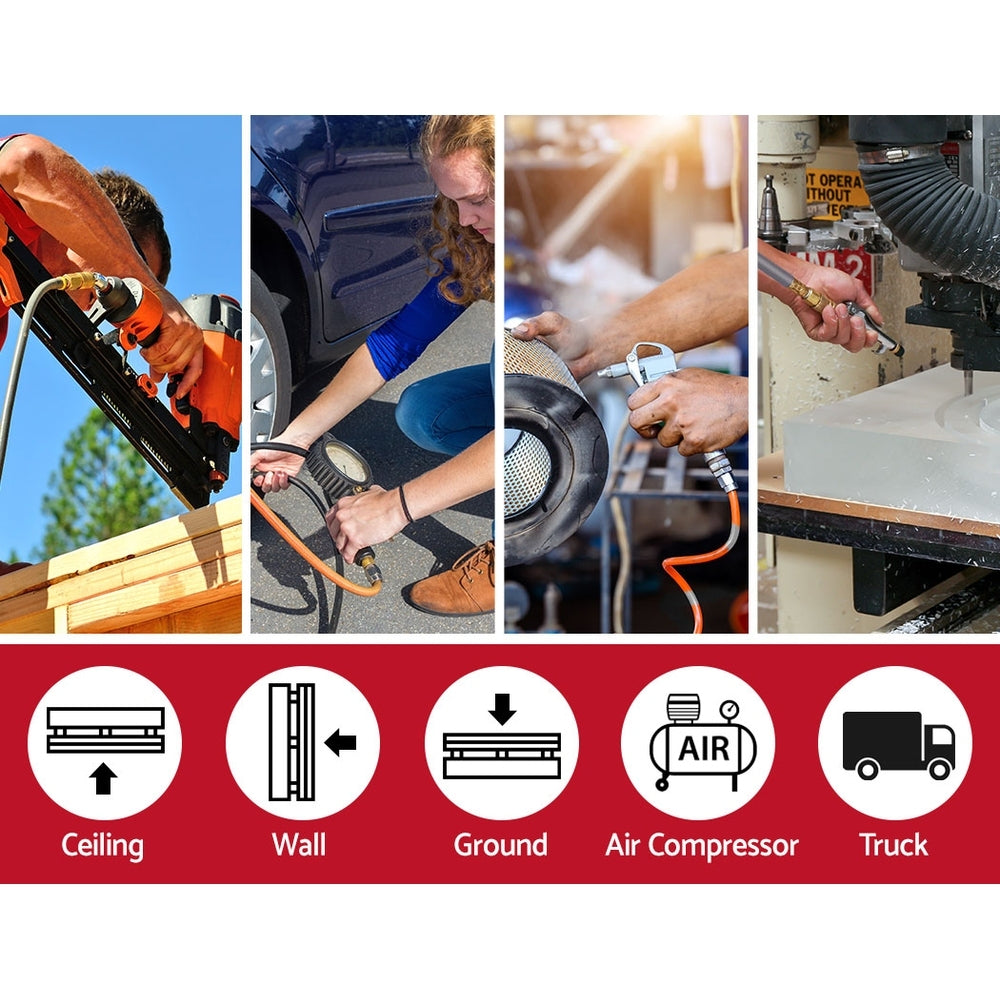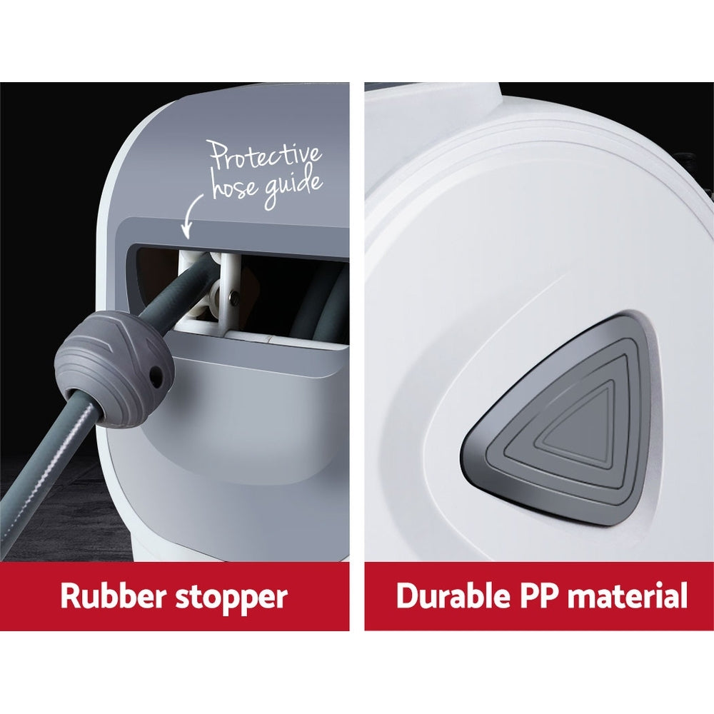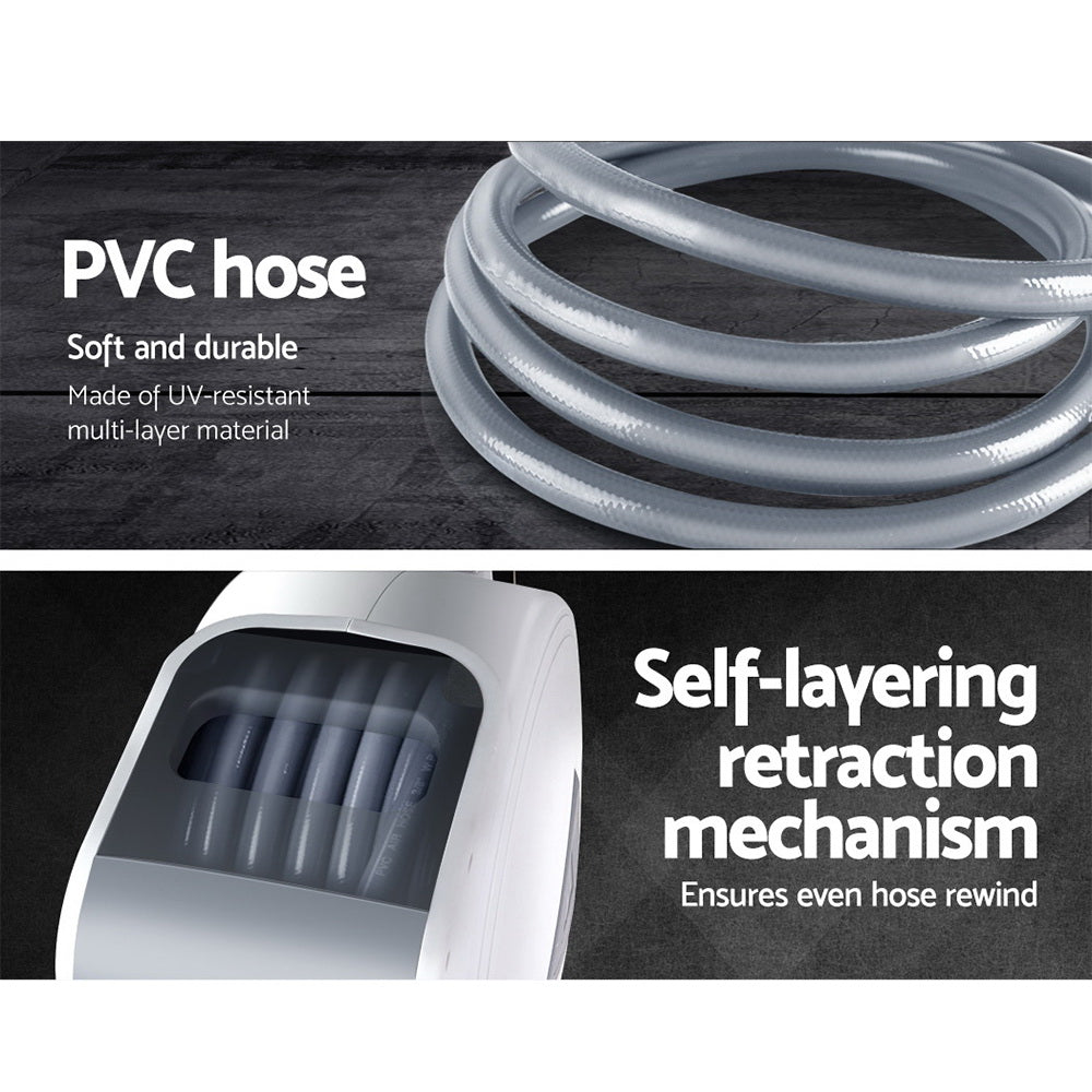 If you are looking for a long and retractable air hose reel for your home or commercial workshop, then consider the GIANTZ Wall Mounted Retractable Air Hose Reel. With a 20m or 10m hose (depending on model) that offers you unbridled movement around your workshop from one connection point, the retractable air hose reel comprised a UV-resistant PVC hose with premium stainless steel ¼" BSPT AU quick-connect fittings. Linking the hose to a compressor is easy via the leader hose that connects to the side of the unit. The spring-loaded hose utilises an incremental feed lock that allows the extended hose to stay put at its place. And after the work is done, just give a hose a firm tug to activate its auto rewind function. As it rewinds, its self-layering mechanism will ensure that the winding is done neatly and evenly within the casing. The air hose reel can be swivelled 180° when mounted on the wall to allow easy hose movement around corners. If required, the entire unit can be removed by slotting out the quick-release hinge rod and secured with the same at another location within the workplace. Other handy features include a rear leader hose holster that provides a safe and tidy connection between the compressor and reel, an internal access hatch located at the top of the casing and a swivel carry handle.