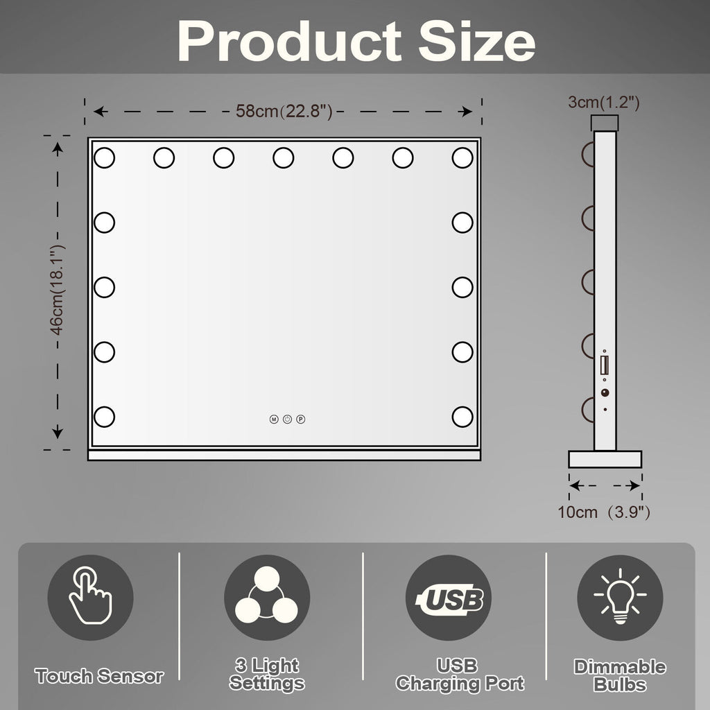 - Enhanced Lighting Options - Illuminate your beauty routine with 15 LED bulbs surrounding our 58x46cm Hollywood Makeup Mirror, featuring adjustable settings for warm white, natural white, and cold white light to perfectly match the lighting needed for any occasion or time of day.