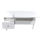 Modern and stylish white coffee table designed with a lift top, which can be easily adjusted to a suitable and comfortable height to use a laptop, write or dine while relaxing on the couch, and revealing hidden storage beneath for books and magazines.