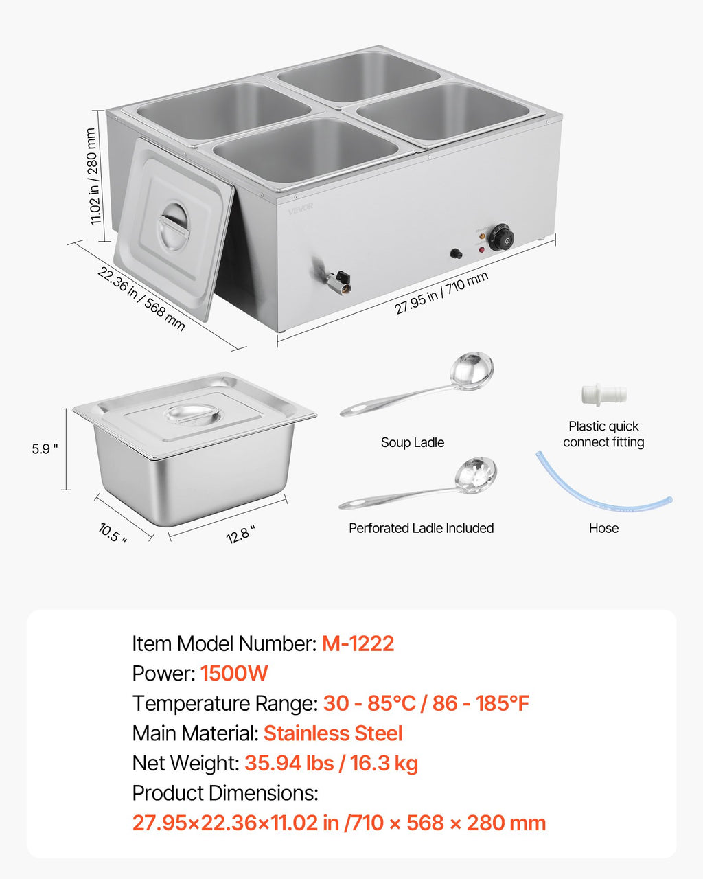 With a standard 5.9 in depth, this buffet bain marie comes with 4 x 1/2 size pans that fit all 5.9 in deep compartments. You can combine or swap them easily, creating menus from soups and sauces to stews, nacho cheese, or chocolate